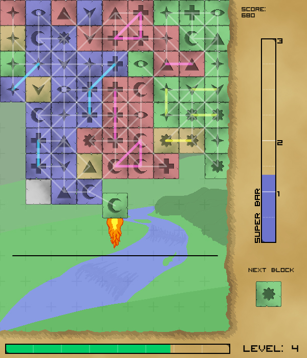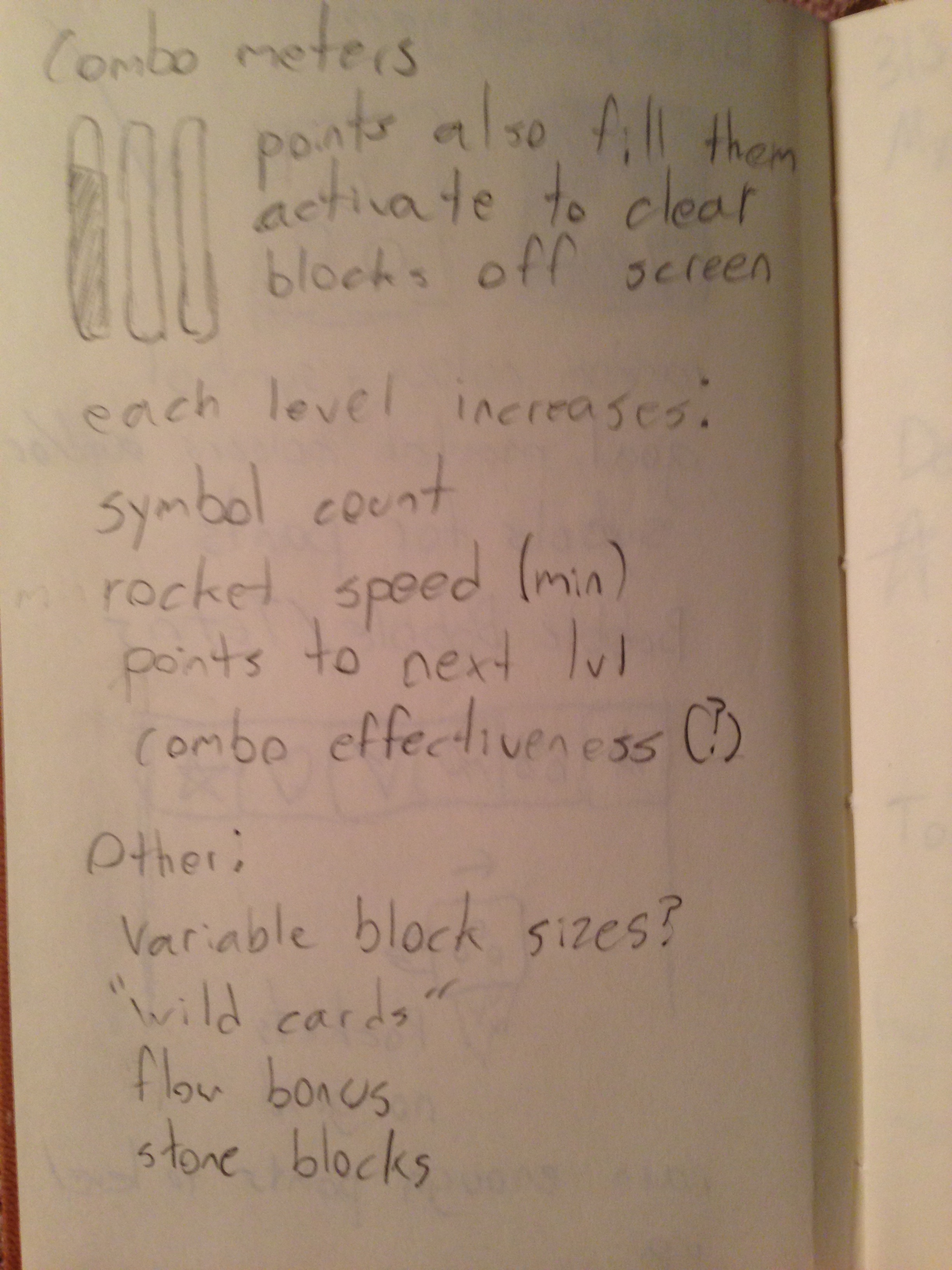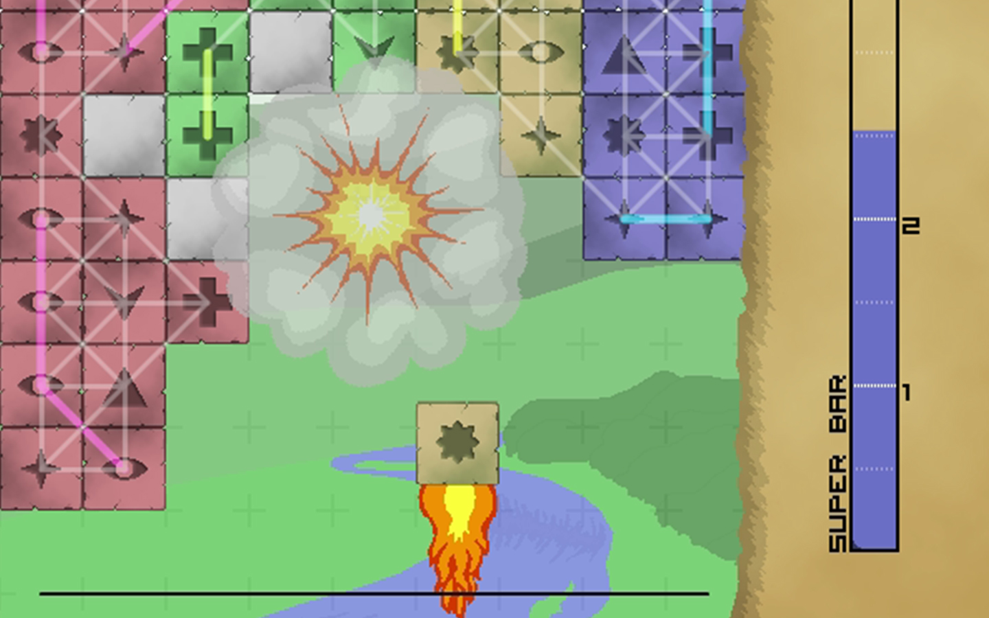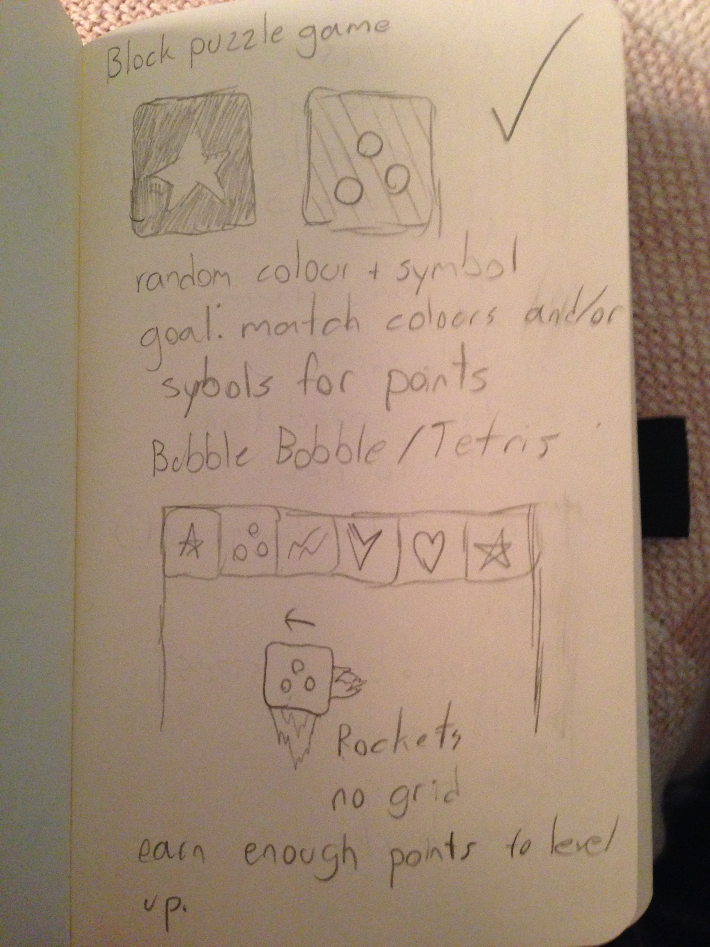 Work on Rocket Blocks began on paper. Much of the design was unchanged from my original sketches. I first created a vertical slice prototype over the course of a few days. It included many elements of the final game but was too slow and buggy and so it was scrapped. Taking what I had learned I simplified the code to reduce memory usage and increase performance. The remaining time was spent on visuals and game feel. A lot of attention was paid to the frequency of various special blocks. The final version of the game has been meticulously balanced so that a skilled player can continue playing almost indefinitely. You can try the game for yourself here (Requires Flash).